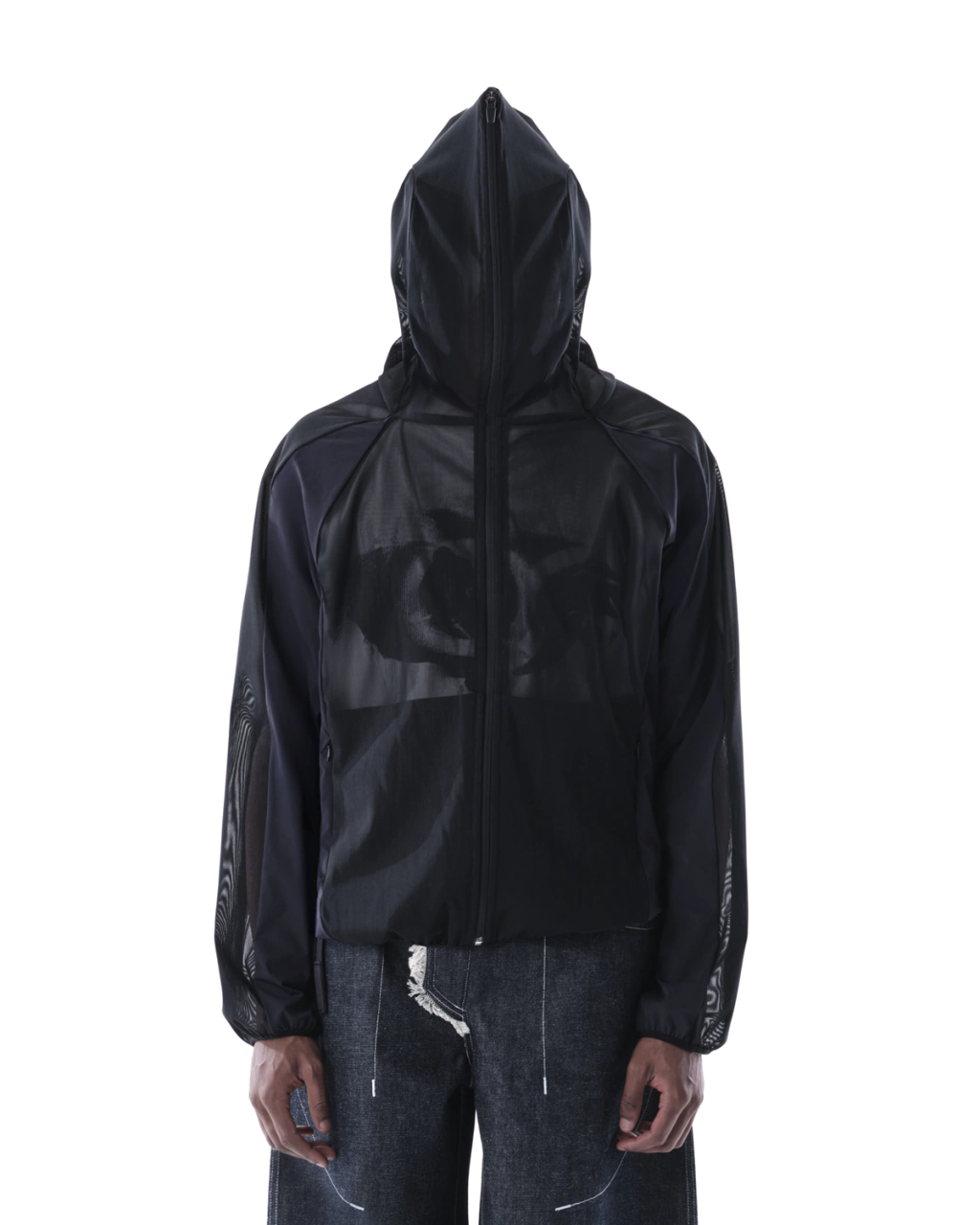 • Destaque para a ‘máscara’ que pode ser formada a partir do fechamento total do zíper, possibilitando que o usuário ainda enxergue ao seu redor devido ao uso do tecido translúcido